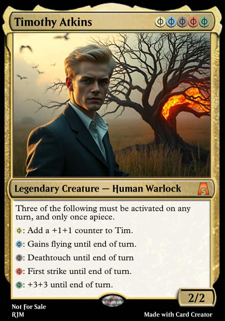Powers: After he becomes a warlock, Tim picks and chooses his spells from a wide swath of the elemental spectrum. Tim is in incredible shape and blessed with quick reflexes, which accentuate his talents barehanded, whilewielding a blade, and especially a firearm. His arsenal of spells is focused on infiltration for covert ops, but also offensive spells for when things go sideways.